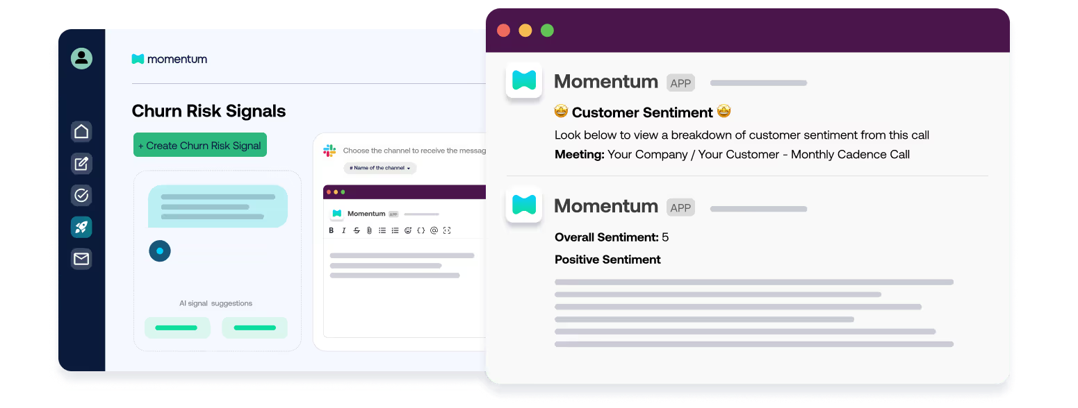 After adopting Momentum, teams stop chasing admin work. Customer success notes and cases are captured automatically, logged in Salesforce, and kept in sync with their workflows, which saves hours and keeps data clean. Momentum also flags risk signals from customer interactions and sends instant Slack notifications, so the team can step in early and protect retention.